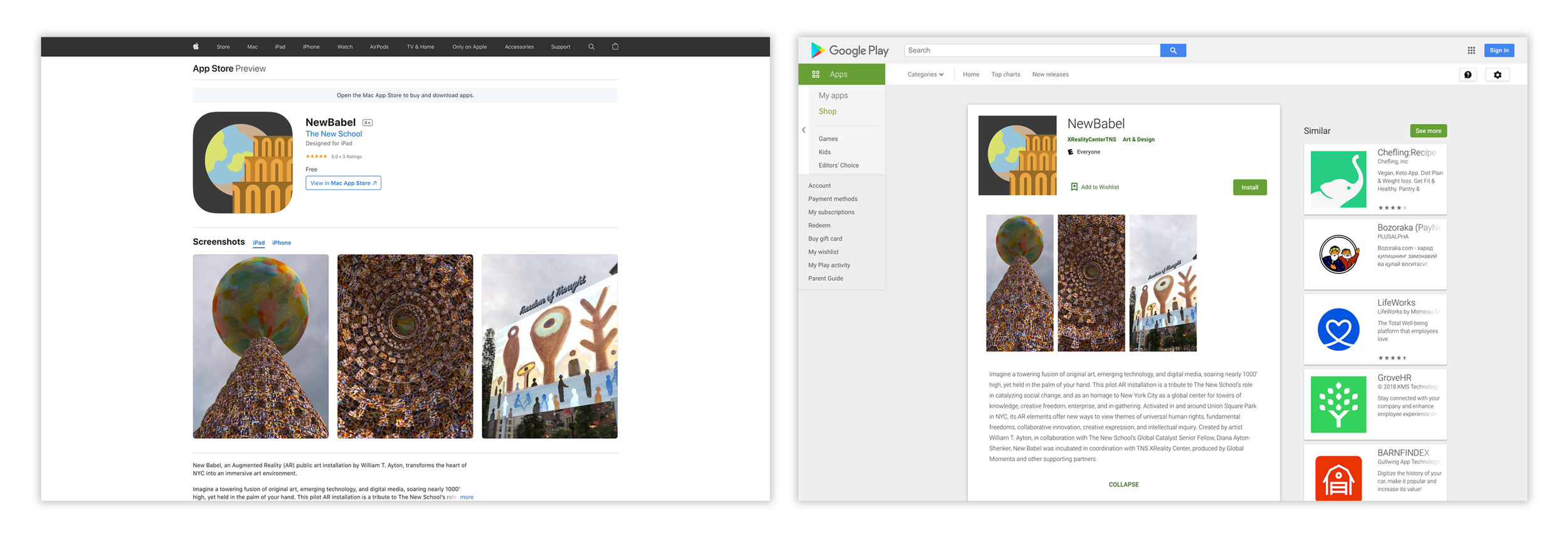 New Babel is Augmented Reality (AR) public art installation that transforms the heart of NYC into an immersive art environment. GPS-based, it activates a collection of large-scale AR art at Union Square Park, NYC. Audience can explore the art with a distant or closer look, even they can experience inside of the 3D art. This AR installation symbolizes endeavor towards social change, and as an homage to New York City as a global center for towers of knowledge, creative freedom, enterprise, and in-gathering.